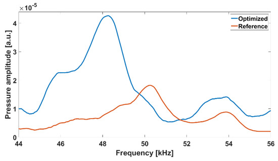 This resonance is selected for optimization because PA glucose measurements using the open T-shaped resonator are usually performed at this frequency [13,14]. The resonance spans a relatively wide frequency range between 48 kHz to 51 kHz due to a superposition of two resonances [21]. Therefore, the PA signal is calculated in this range during the optimization.