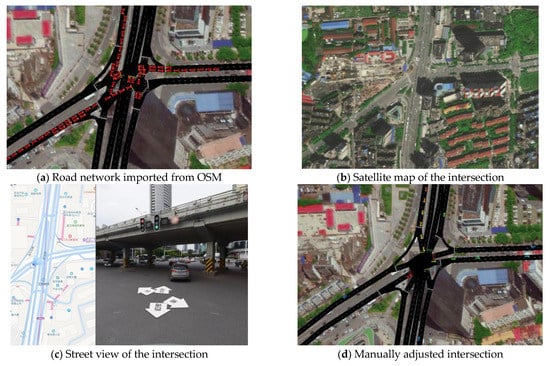 The region we chose in Wuhan is the Jianghan Zone, which is one of the most historic and busiest areas in Wuhan. To simulate the actual traffic of Jianghan, the road network and the traffic volume has to be reproduced. Like most kinds of simulations in these fields, Open-Street Map (OSM) was used to attain the positions and directions of the roads. In particular, nearly all of the intersections in OSM are different from the real intersections (see Figure 1), and the unrealistic isolated traffic lanes will trigger unrealistic traffic jams. In Figure 1a), the vehicles on the right side must wait for three traffic lights to pass this intersection. In the scenario of the Jianghan area, 1243 roads/edges and 562 intersections/nodes are included. The systematic inaccuracy needs to be verified manually for each road and intersection, which is an extraordinary tedious and time-costly work. In order to construct the actual road structure of Jianghan, we adjusted the intersections through street view. Despite the popularity of Google maps, AutoNavi map is used in this study because of their higher quality and more complete data in China [18].