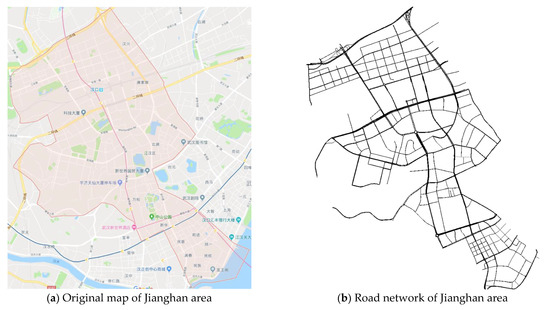(a) Original Map and (b) abstracted road network of Jianghan Zone.