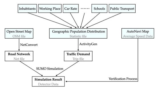 We used ActigvityGen to generate trip files in SUMO according to geographic population data mentioned above, and then it was necessary to construct a route file. In this study, the DUAROUTER, which is another attachment program of SUMO, was applied to decide the route of the vehicle. This program inspects the minimum travelling time path between origin and destination written by the trip file using Dijkstra [23] method. We assumed that people use an intelligent navigation system to find their quickest way to work and going home, the same as the Dijkstra method. To optimize the distribution of trips, we used dynamic user equilibrium recommended by SUMO. The dynamic user equilibrium is based on the principle that through multiple iterations, all the vehicles will find the most timesaving way. The route file generated from geographical population distribution was iterated with a python program, also a sub-program provided by SUMO. It generates a new route file after each step of iteration. Then, based on the new generated route file, another step of iteration is launched. After 100 time-iterations, we chose the best trip distribution as our route file. The flow chart of the process of building the simulation and the data type have been used are shown in Figure 3, where the data in blue boxes were obtained from the Internet.