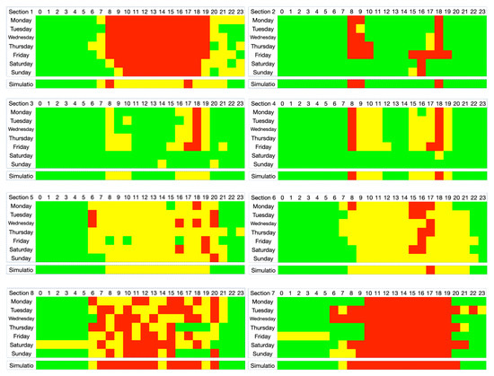 The hourly simulated traffic status of the 8 verification points is also recorded in Figure 5. The simulation represents a normal working day, the simulation time in seconds is calculated as day time, and if the average speed of vehicles at the road Section 1 between 28,800 s and 32,400 s is over 30 km/h, the grid at 8:00 of simulation of road Section 1 is painted into green. In this way, all hourly simulated traffic status of 8 road sections is recorded in Figure 5.
