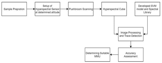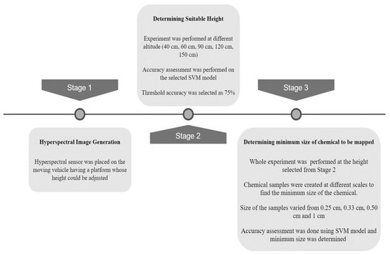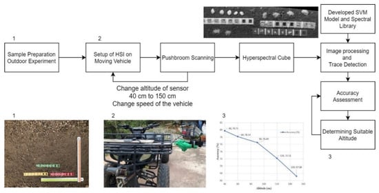 As was mentioned above, the objective of this paper is to determine and suggest the altitude of the sensor and minimum mapping size of pure chemical for finding traces of chemicals with an accuracy above 70%, as shown in conceptual Figure 2. The approach used to achieve this objective is shown in Figure 3 and Figure 4. The experiments were conducted in outdoor conditions and suitable altitude and minimum mapping size of the chemicals were identified using the SVM model and spectral library developed in []. The principal component analysis and first derivative were used to select 22 optimal wavelengths out of 144 wavelengths in the range of 400–1000 nm. These selected wavelengths showed distinct spectral features and were input to the SVM model. The algorithm selects the most suitable hyperplane on the basis of maximum margin between each class. For classification of spectral data SVM has been proved as a reliable and efficient method. In this study, SVM was performed on R studio using a radial bias function along with 10-fold cross validation, which explain the relation between the target variable and independent variable, and grid search procedure. Classification accuracy is used to assess the performances of SVM models. Chemical samples of AN, TNT and C4 were prepared in different sizes which varied from 0.25*0.25 cm to 1 cm*1 cm as shown in Figure 3. The dimensions of the chemical samples were measured accurately using the measuring instruments and distributed over the soil, which acted as the background material. The experiment was performed on a bright sunny morning at 10 am, with sun azimuth equal to 94, and altitude above horizon equal to 53.6. The hyperspectral sensor was placed on the vehicle at different altitude varying from 40 cm to 150 cm. The speed of the vehicle is determined using the in-built software of the sensor (Cube Creator by BaySpec). The speed of the vehicle holding the sensor is suggested to user depending upon the side overlap the user has requested for the mentioned altitude. These chemical samples were placed over the soil samples and marked with different colors for accuracy assessment in later part of the experiment. The reflectance data was obtained by BaySpec OCI F hypespectral sensor, which consists of a charge coupled device that has a readout mode. The images were acquired by pushbroom scanning at 45 frames per second with a field of view of 22°, focal length of 16 mm in 144 bands with spectral resolution of 4.16 nm from 400–1000 nm. Hyperspectral cube was created for the chemical samples at different heights using pushbroom scanning. To detect the traces of the chemicals, present in the hyperspectral cube, the image is converted into tiff format which goes as an input to the SVM model. The SVM model determines the traces of the chemical samples present and accuracy assessment is done for all the images acquired at different altitude of the sensor. The suitable altitude is selected for the next experiment where the altitude is fixed and the MMS size of the chemicals are varied. The hyperspectral cube is generated and the SVM model is used to determine how many samples of each MMS were detected correctly and incorrectly. The conceptual design of the experiment is shown in the Figure 4, which gives information on how the experiment was conducted in terms of varying the altitude of the sensor and size of the chemical samples.