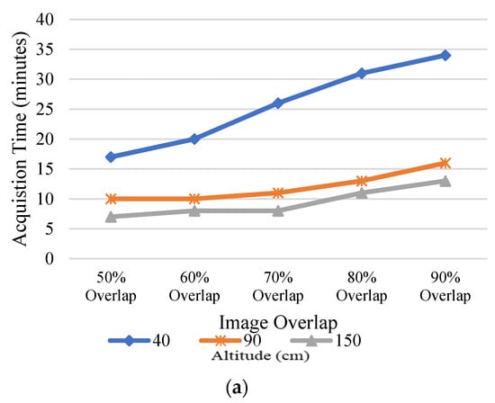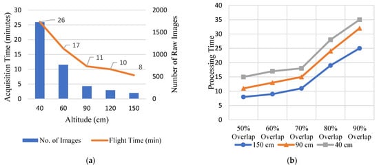 (a) Acquisition time for different altitude at 70% image overlap; (b) Image processing time in minutes for different overlap percentage at 40 cm, 90 cm, 150 cm, respectively.