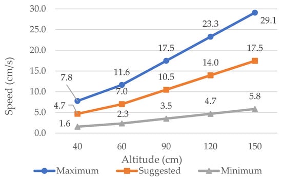 Following are the results about determining the speed of the sensor for different altitude. According to the manufacture of the sensor the suggested speed is based upon the percentage of image overlap user wants. The SpecGrabber, which is the software used for controlling the sensor, and calculates the suggested speed based on the altitude, field of view, swath and consider image overlap as 70%. Speed is calculated for different altitude and different overlap percentage, as shown in Table 3, and in Table 4 the suggested speed for different altitude is shown. The vehicle operator can select the speed from the Table 3 based on their requirement of overlap. Figure 8 shows the minimum, maximum and suggested speed. Table 5 discusses the flight time and number of raw images the sensor will store when scanning an area of 10 m2 at a speed of 10.5 cm/s at different altitude.