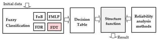 This classification principle can be used for the structure function building based on incomplete or uncertain data, too. The structure function building must take into account two aspects. The first is the incomplete specification of system states, which needs finding, and determination of the unspecified system states. The second represents the ambiguity of the data values. Therefore, the structure function building can be interpreted as a classification task for incomplete or uncertain data. It is a typical task of Data Mining [37,44,45]. One of the approaches for solving this task is the application of a Fuzzy Decision Tree [14,44].