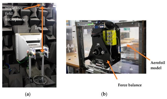 (a) Typical set up for the aerofoil noise experiments at the Brunel aeroacoustics wind tunnel for the turbulence–leading edge interaction noise; (b) load cell system used for the lift/drag measurements in a closed-section aerodynamic wind tunnel.