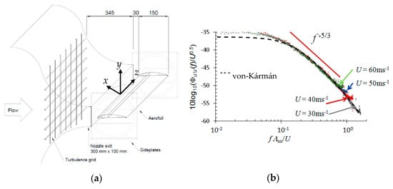 To determine the level of the freestream turbulence intensity (Tu) at the location coincides with the leading edge of the aerofoil (but without the presence of the aerofoil), a single hot wire was used to measure the streamwise velocity fluctuations u’. The diameter and length of the hot wire are 5 μm and 1.25 mm, respectively. The hot wire was operated at an overheat ratio of 1.6. Placing the hot wire probe at 30 mm downstream of the nozzle exit, which corresponds to the leading edge of aerofoil when fixed to the side plates, the background Tu produced by this wind tunnel (i.e., without placing turbulence grid inside the nozzle, and without the aerofoil) is between 0.1 and 0.2%. In order to generate elevated level of Tu, a bi-planar turbulence grid was placed inside the nozzle, as shown in Figure 2a. Using the same hot wire probe, and without the presence of the aerofoil, the Tu has been identified for this study as the average value encompassing the two-dimensional y–z plane, which is calculated as Tu≈4.5%. The measured PSD of the fluctuating velocity, which is presented in Figure 2b, can be seen as nearly isotropic as demonstrated by the relatively good match with the von-Kármán universal spectrum for the longitudinal velocity fluctuation. This theoretical spectrum is represented by the following equation: