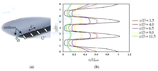 (a) Isometric drawing of the NACA 65(12)-10 aerofoil model with blowing leading edge; (b) streamwise development of the velocity profiles produced by the leading edge blowing under the configuration of λ’ = 5 mm, Q = 208 L/min, and quiescent condition.