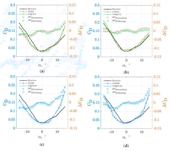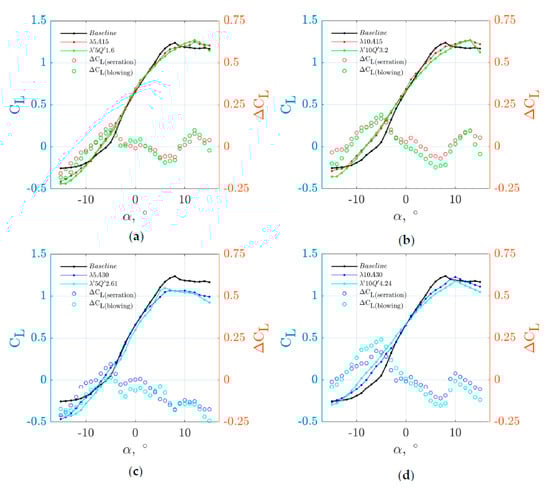 where a positive value of ΔCL denotes a higher lift coefficient generated by either the serrated leading edge or blowing leading edge, at a particular α, compared to the baseline aerofoil. The opposite is true. The difference in the drag coefficient ΔCD (to be shown in Figure 6) is also defined in a similar fashion, i.e., a positive ΔCD means that a larger drag coefficient is produced by the treated aerofoil, and vice versa.