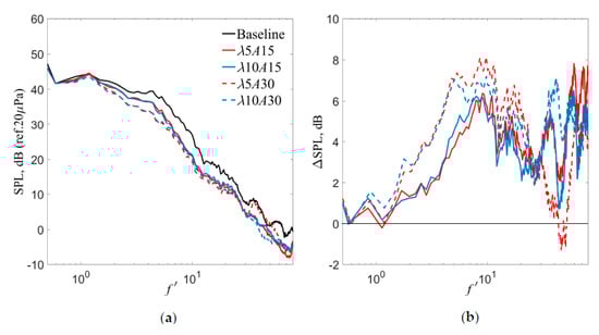 Comparison of (a) SPL and (b) ΔSPL as a function of normalized frequency f ‘ produced by the baseline and serrated leading edges at U = 25 ms−1 and α = 0°.