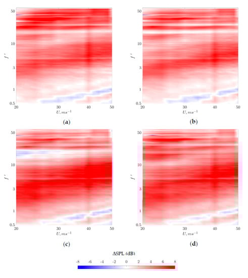 Comparison of ΔSPL as a function of f ‘ and U at α = 0° produced by the serrated leading edges (a) λ5A15; (b) λ10A15; (c) λ5A30; and (d) λ10A30.