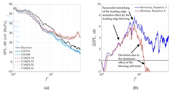 From the acquired dataset, a selection of the acoustic spectra subjected to leading edge blowing within the range of 6.14 ≤ Q ‘ ≤ 6.41 L/minute is presented here. Figure 9a shows the acoustic spectra produced by the leading edge blowing for the λ’10Q ‘6.14, λ’10Q ‘6.22, λ’10Q ‘6.32, and λ’10Q ‘6.41 at U = 45 ms−1. Acoustic spectra produced by the λ10A15 and λ10A30 serrated leading edges are also included for comparison. Note that the comparison between the serrated and blowing leading edges is based on the matching value of λ and λ’, respectively. In order to provide a clearer picture of the comparison, the mean-difference in the SPL level between the baseline and treated aerofoil is defined below: