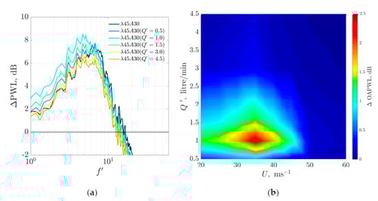 (a) Comparison of ΔPWL as a function of normalized frequency f ‘ produced by the baseline and either the serration-only (λ45A30) and hybrid leading edge device (λ45A30 + blowing Q ‘) at U = 40 ms−1 and α = 0°. The leading edge blowing range covers 0.5 ≤ Q ‘ ≤ 4.50 L/min, and (b) contour map of ΔOAPWL produced by the difference in OAPWL between the serration-only (λ45A30) and hybrid (λ45A30 + Q ‘), as a function of Q ‘ and U at α = 0°.
