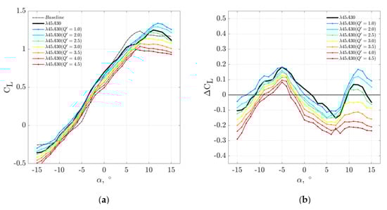 Because of the different responses of CL and CD against the Q ‘, it would be of interest to examine the ratio between them. Defining ΔCL/CD (α) = CL/CD treated(α) − CL/CD baseline(α), Figure 14a,b show the CL/CD and ΔCL/CD against the angles of attack α produced by the baseline, serration-only (λ45A30) and hybrid (λ45A30 + Q ‘ = 1.0–4.5 L/min) leading edge device at U = 25 ms−1, respectively. The most significant results lie in the region of 3° ≤ α ≤ 8°, where the serration-only case would have performed poorly. The hybrid device is no doubt a better choice than the serration-only case. More importantly, it can even outperform the baseline aerofoil as soon as the Q ‘ is introduced. The improvement increases as the Q ‘ increases. At α ≥ 10°, although not as good as the baseline aerofoil, the hybrid device still outperforms the serration-only aerofoil when a finite range of optimal Q ‘ is utilised. The impact of adding leading edge blowing to the serration at negative angle of attack, however, is less beneficial.