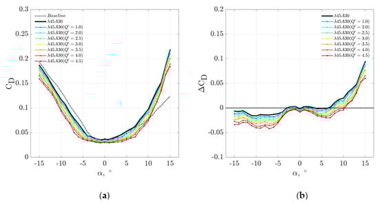 Comparison of the (a) CD as a function of α produced by the baseline and hybrid (λ45A30 + blowing Q ‘) leading edge device at U = 25 ms−1. The leading edge blowing range covers 0.0 (serration only) ≤ Q ‘ ≤ 4.5 L/min, and (b) The corresponding ΔCD as a function of α, where ΔCD is the difference in CD between the hybrid (λ45A30 + Q ‘ = 0.0–4.50 L/min) and the baseline.