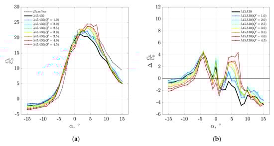 Comparison of the (a) CL as a function of α produced by the baseline and hybrid (λ45A30 + blowing Q ‘) leading edge device at U = 25 ms−1. The leading edge blowing range covers 0.0 (serration only) ≤ Q ‘ ≤ 4.5 L/min, and (b) The corresponding ΔCL as a function of α, where ΔCL is the difference in CL between the hybrid (λ45A30 + Q ‘ = 0.0–4.50 L/min) and the baseline.