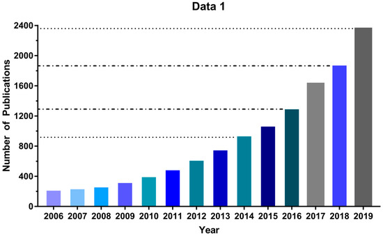 Due to its low cost and ease of implementation, the MTT assay [26] has been extensively employed over the past 30 years to evaluate new PDTs, and its use continues to increase: Between 2006 and 2019 the number of publications found in Google Scholar using “MTT assay” and “Photodynamic Therapy” as search terms increased by a factor of 10, reaching more than 2000 in 2019 (Figure 1). Nonetheless, some important technical complexities and limitations can lead to inappropriate use of the MTT assay. For instance, excess MTT salt concentration can lead to nonspecific cell death depending on the cell type [32] and cell density directly correlates with resistance to oxidative stress in vitro [33]. Moreover, the assays rely on the reduction of MTT, a cell-permeable yellow compound, to a purple (500–600 nm light-absorbing) formazan product by NADPH-dependent enzymes in the mitochondria of viable cells; but a variety of potential photosensitizing compounds can directly reduce MTT to formazan, affecting the reliability of the assay [34,35,36,37,38]. Finally, a method of normalizing MTT assay experimental data to allow for inter-laboratory comparability is lacking, despite its key importance for the discovery of new PDT photosensitizers. Therefore, in this study, we sought to standardize the MTT protocol for in vitro photodynamic assays. Using the MTT assay in glioblastoma (U87, GL261) and neuroblastoma (SHSY5Y) cell lines, we determined the dark cytotoxicity of the methylene blue (MB) photosensitizer and were able to identify several pitfalls that influenced our results. Also, parameters used in high throughput screening (HTS) assays were used to optimize the MTT assay, decreasing the signal-to-noise ratio. As a result, we describe here a standardized protocol for using the MTT assay by applying HTS that should increase reliability and reproducibility levels in photosensitizer discovery.