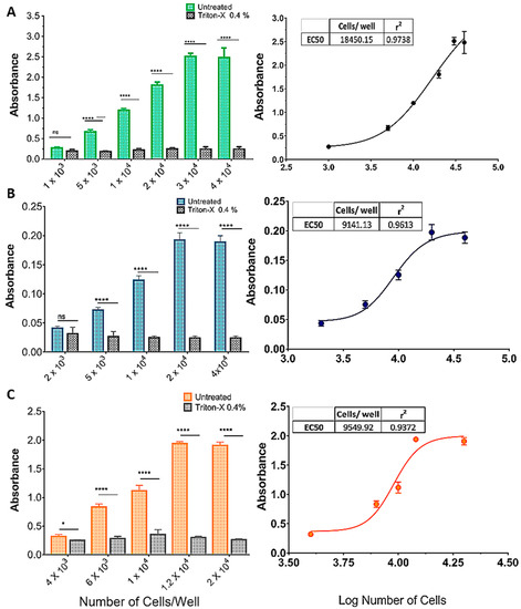 Standardization of the cell inoculum for the MTT reduction assay. (A) SHSY5Y, (B) U87, and (C) GL261 cell lines. The graphics show the effect of increasing cell densities on OD570 in an MTT protocol with or without incubation with Triton X-100 (0.4%). As cell density increased, so did the difference between treatments, in an S-shaped curve (A–C). For the SHSY5Y (A) and U87 (B) cell lines, there was no difference between treatments (p > 0.001) at the lowest densities (1 × 103 and 2 × 103, respectively), whereas for the GL261 cell line, Triton yielded a significantly higher absorbance at 4 × 103 cells/well. The effect of cell density was saturated for the SHSY5Y, U87, and GL261 cell lines at 3 × 104, 2 × 104, and 1.2 × 104 cells/well, respectively (A–C). Data are expressed as mean ± standard deviation. To test the homogeneity of variance, we used Bartlett’s test. For the statistical comparison of the data, we used two-way ANOVA followed by Sidak’s post-test (p < 0.001), ns = not significant, (* = p < 0.05; **** = p < 0.001). Graphs represent three independent experiments performed in triplicate.