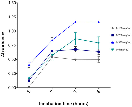 Effect of MTT concentration and incubation time on the U87 cell line. The graph represents the values of the absorbances as a function of incubation time. After 3 h of incubation at 37 °C, the absorbance reaches a plateau. The colored lines represent the MTT salt concentrations (gray = 0.125, dark blue = 0.250, light blue = 0.325, and green = 0.5 mg/mL MTT salt). Data are expressed as mean ± standard deviation. Representative graphs of three independent experiments performed in triplicate.