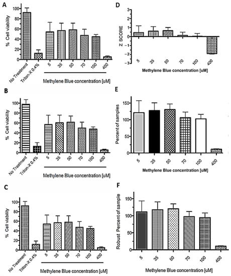 Data normalization methods applied to MTT assay after PDT. SHSY5Y cells were incubated in plates with different concentrations of methylene blue (MB) (from 5 to 400 μM) and then exposed to light for a 6 min treatment, then 0.75 mg/mL MTT was added (final concentration). The absorbance was measured after 3 h and the read in OD570 values were normalized as: (A) Percent of control. (B) Percent of maximum OD570. (C) Percent of the median of control. (D) Z score. (E) Percent of samples. (F) Robust percent of samples. Data are expressed as mean ± SD. Graphs are representative of three independent experiments performed in triplicate.