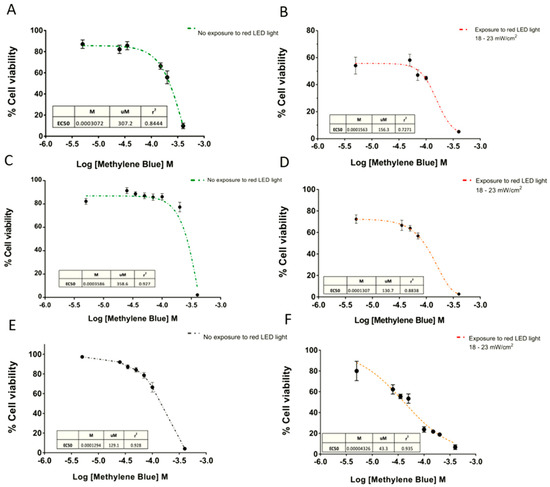 On the other hand, the EC50 curves exhibited a cytotoxic effect depending directly on the MB concentration (Figure 5). Consequently, higher doses of MB with the same time exposure of red light achieved significantly greater cytotoxic effects.