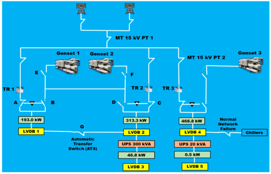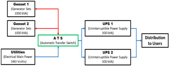 As can be seen in Figure 7, the ATS manages the generators—if it does not work, then the generators must be activated manually, which hurts the system. Additionally, it can be emphasized that only one ATS is installed. Thus, the question arises: how do the above circuit behaviours answer to the expected security system? To respond to this question, the present situation was simulated and a solution to solve the identified handicap with block diagrams, as shown in Figure 8 and Figure 9, is proposed [30].