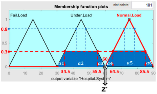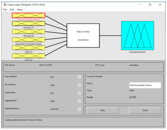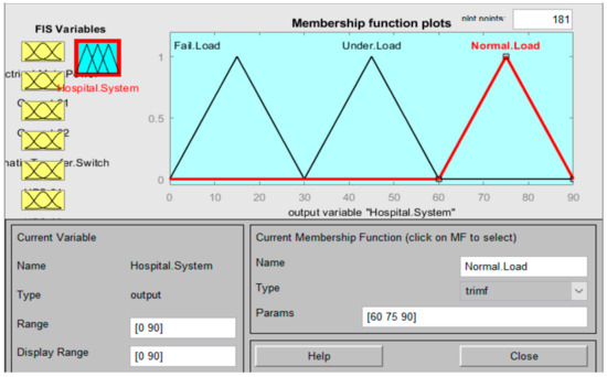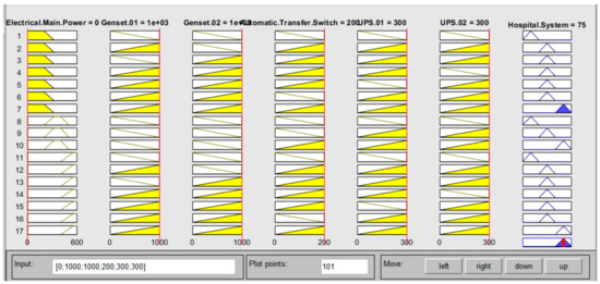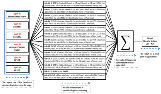 The next step is to apply the fuzzy operator “AND & THEN” in fuzzy rules, and the fuzzy rules that are by data collected and processed according to fuzzy logic with the following 17 rules: (1) If (Electrical Main Power is Low) and (Genset1 is Off) and (Genset2 is Off) and (Automatic Transfer Switch is Not Function) and (UPS1 is Off) and (UPS2 is Off) then (Hospital System is Failing Load); (2) If (Electrical Main Power is Low) and (Genset1 is On) and (Genset2 is Off) and (Automatic Transfer Switch is Function) and (UPS1 is On) and (UPS2 is On) then (Hospital System is Under Load); (3) If (Electrical Main Power is Low) and (Genset1 is Off) and (Genset2 is On) and (Automatic Transfer Switch is Function) and (UPS1 is On) and (UPS2 is On) then (Hospital System is Under Load); (4) If (Electrical Main Power is Low) and (Genset1 is On) and (Genset2 is On) and (Automatic Transfer Switch is Function) and (UPS1 is On) and (UPS2 is Off) then (Hospital System is Under Load); (5) If (Electrical Main Power is Low) and (Genset1 is On) and (Genset2 is On) and (Automatic Transfer Switch is Function) and (UPS1 is Off) and (UPS2 is On) then (Hospital System is Under Load); (6) If (Electrical Main Power is Low) and (Genset1 is On) and (Genset2 is On) and (Automatic Transfer Switch is Not Function) and (UPS1 is On) and (UPS2 is On) then (Hospital System is Under Load); (7) If (Electrical Main Power is Low) and (Genset1 is On) and (Genset2 is On) and (Automatic Transfer Switch is Function) and (UPS1 is On) and (UPS2 is On) then (Hospital System is Normal Load); (8) If (Electrical Main Power is Normal) & (Genset1 is Off) and (Genset2 is Off) and (Automat-ic Transfer Switch is Not Function) and (UPS1 is Off) and (UPS2 is Off) then (Hospital System is Failing Load); (9) If (Electrical Main Power is Normal) and (Genset1 is Off) and (Genset2 is Off) and (Automatic Transfer Switch is Not Function) and (UPS1 is On) and (UPS2 is On) then (Hospital System is Under Load); (10) If (Electrical Main Power is Normal) and (Genset1 is Off) and (Genset2 is Off) and (Automatic Transfer Switch is Function) and (UPS1 is On) and (UPS2 is On) then (Hospital System is Normal Load); (11) If (Electrical Main Power is High) and (Genset1 is Off) and (Genset2 is Off) and (Automatic Transfer Switch is Not Function) and (UPS1 is Off) and (UPS2 is Off) then (Hospital System is Failing Load); (12) If (Electrical Main Power is High) and (Genset1 is On) and (Genset2 is Off) and (Automatic Transfer Switch is Function) and (UPS1 is On) and (UPS2 is On) then (Hospital System is Under Load); (13) If (Electrical Main Power is High) and (Genset1 is Off) and (Genset2 is On) and (Automatic Transfer Switch is Function) and (UPS1 is On) and (UPS2 is On) then (Hospital System is Under Load); (14) If (Electrical Main Power is High) and (Genset1 is On) and (Genset2 is On) and (Automatic Transfer Switch is Function) and (UPS1 is On) and (UPS2 is Off) then (Hospital System is Under Load); (15) If (Electrical Main Power is High) and (Genset1 is On) and (Genset2 is On) and (Automatic Transfer Switch is Function) and (UPS1 is Off) and (UPS2 is On) then (Hospital System is Under Load); (16) If (Electrical Main Power is High) and (Genset1 is On) and (Genset2 is On) and (Automatic Transfer Switch is Not Function) and (UPS1 is On) and (UPS2 is On) then (Hospital System is Under Load); (17) If (Electrical Main Power is High) and (Genset1 is On) and (Genset2 is On) and (Automatic Transfer Switch is Function) and (UPS1 is On) and (UPS2 is On) then (Hospital System is Normal Load).