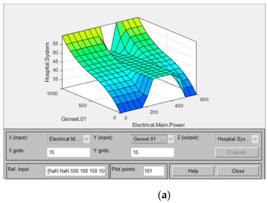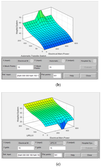 Fuzzy inference system (FIS) surface viewer for Electrical Main Power (EMP), Genset1 and Genset2, Auto Transfer Switch (ATS), UPS1, and UPS2 is shown in Figure 22a–c.