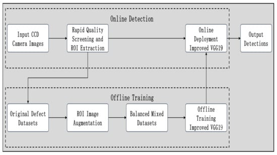 The remainder of this paper is organized as follows. In Section 2, we compare our work with related research, with a focus on surface defect detection algorithms and imbalanced learning algorithms. In Section 3, by the use of our improved gray projection algorithm, we undertake detector rapid screening of the strip steel surface and extract defect regions. In Section 4, our ROI image augment algorithm augments smaller classes and makes images balance again using the data level approach method. In Section 5, the improved transfer learning deep neural network based on VGG19 detects and identifies the few samples and imbalanced strip steel dataset. In Section 6, we compare the real-time performance between our network and some deep learning detection algorithms. Section 7 concludes this paper with some future research directions. In Figure 1, we present the overview of the strip steel defect detection method of this paper.