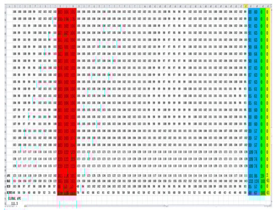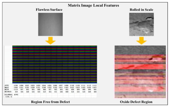 As shown in Figure 5, the strip steel defect acquisition region image in Figure 3 was transformed into a corresponding gray-scale matrix. With the help of the gray-scale projection algorithm proposed in this paper, various kinds of defect regions can be rapidly screened. The gray-scale matrix’s GlobalAvg = 111.3083, threshold value (1 ± μ) GlobalAvg is from 77.9 to 144.7.