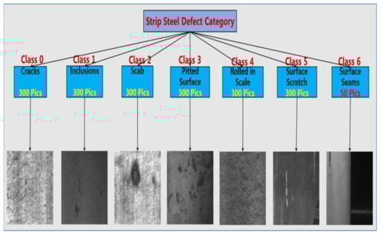 The key to machine vision surface detection technique is developing various types of defect detection algorithms. Due to strip steel’s rapid movement on the production line, it will produce a large amount of image data (for example, 25 frames/sec), which demands an excellent real-time defect detection algorithm. It also can lead images captured by CCD cameras to be of low resolution and less qualified. Since the defect images captured by CCD cameras fall into numerous categories, are complex, and have boundary overlap, it is typical to have an imbalanced dataset with a small number of samples. When the data has a long-tail distribution, it can lead to bias in the classifier. The classifier is more inclined to identify classes with a sufficient sample size and rich diversity [4,5]. However, it is unfair to ignore other classes. Traditional machine learning algorithms do not have enough data, either in terms of quantity or quality, to train a model.