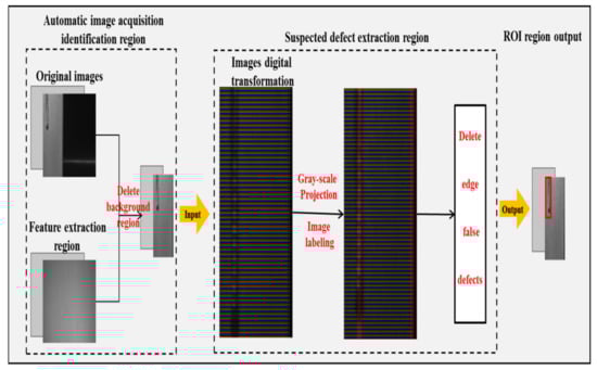 The threshold value of the average gray projection value can be pre-adjusted according to the scene illumination gradation and defect-free strip steel’s gray-scale value. The threshold value is set according to the lighting conditions of each experiment and defect-free strip steel images; it is an empirical value from a large number of comparative tests. After a simple calculation of the average gray projection value and gray-scale value comparison, the strip steel edge region and background can be substantially divided. Figure 3 shows a steel strip defect acquisition region.