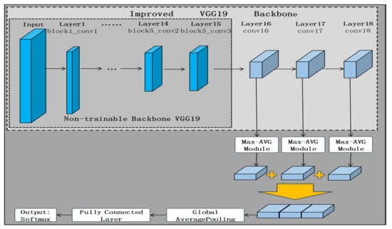 Since the VGG neural network is a linear structure and the network is classically simple, the VGG network was chosen as the backbone network for defect recognition in this paper [27]. The VGG neural network is a transfer learning network series, including VGG11, VGG13, VGG16, and VGG19. The common feature of these network structures is that several convolution layer modules are connected to three full connection layers. Finally, defects are identified and classified through a softmax layer. For example, VGG11 is composed of eight convolution layers and three full connection layers. Similarly, VGG13, VGG16, and VGG19 all contains three full connection layers. However, due to the large number of parameters in the full connection layer, three full connection layers will greatly slow down the efficiency of network training and recognition. Therefore, when the VGG network was selected as the backbone of the pre-training network in this paper, three full connection layers were removed. Compared with VGG19 and, VGG11, VGG13 and VGG16 are shallow networks. Due to the small amount of training data of the network in this paper, the recognition accuracy of the network is relatively low on the shallow network, and the convergence of the network is poor. Therefore, our network needed a fully pre-trained network on ImageNet as the backbone network, so VGG19 was chosen for the transfer learning backbone network in this paper.