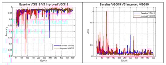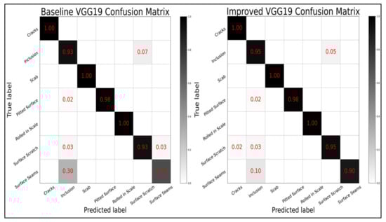 For the differences between the baseline VGG19 and the improved VGG19, we compared their confusion matrix, precision, recall, and F1-score of the two models in Figure 17 and Table 2. The improved VGG19 network performs slightly better than the baseline VGG19 in six types of defects, but the improved VGG19 performs significantly better in the surface seams defects. The experimental results show that the improved VGG19 network proposed in this paper has high practicability and reliability; it has a certain practical value for strip steel defects detection. In view of the limitations of research content, it is hoped that machine vision can be combined with various sensor technologies to achieve the comprehensive evaluation of multi-modal data fusion for defect detection and grading of strip steel, so as to improve the accuracy and real-time performance of this model, and allow it to better adapt to actual strip steel production in the future.