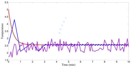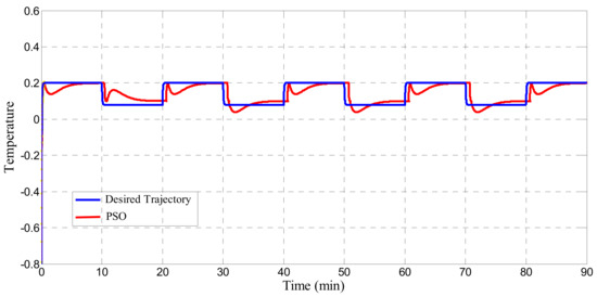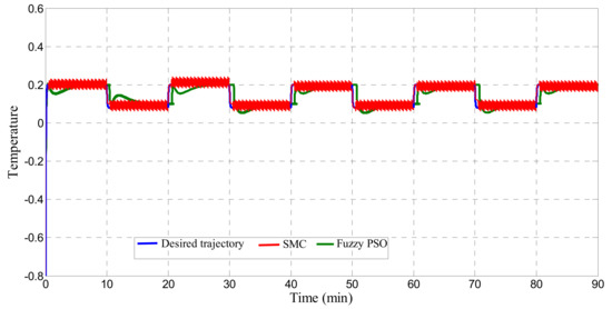 In this quantitative analysis, a fair assessment is performed to detail estimating the performance of the investigated control strategies. Besides the ISE performance indicator, the IAE index, which characterizes how close the dynamics are to the reference trajectory, is addressed as well. In Table 4, this evaluation is specified. The aim is to track the temperature trajectory of the CSTR in the occurrence of hard constrained setpoint variations as presented in [29,30]. The works were performed by designing those regulators and comparing them with results presented in [29]. The outcomes of the synthesized controllers have been analyzed based on (ISE), (IAE) and control effort criteria. The results clearly demonstrate that all investigated control schemes provide an acceptable achievement with respect to the hard constrained functional variations and fast-changing dynamics of the process temperature. This can be highlighted first in ensuring the asymptotic stability in the Lyapunov sense. Specifically, the robustness of the studied techniques in dealing with model uncertainties throughout the output tracking signal takes the emphasized point into account. The numerical values of the above-specified index are very comparable with an added value of saving energy costs. Still, fuzzy PSO SMC-based control structure provides better flexibility and accurate behavior in control action in comparison with peer approaches.