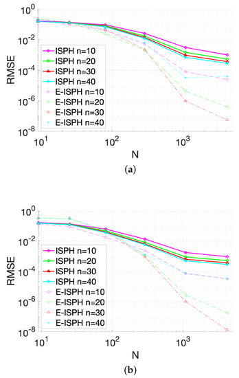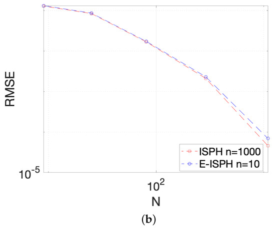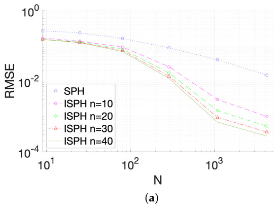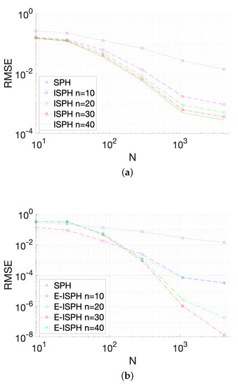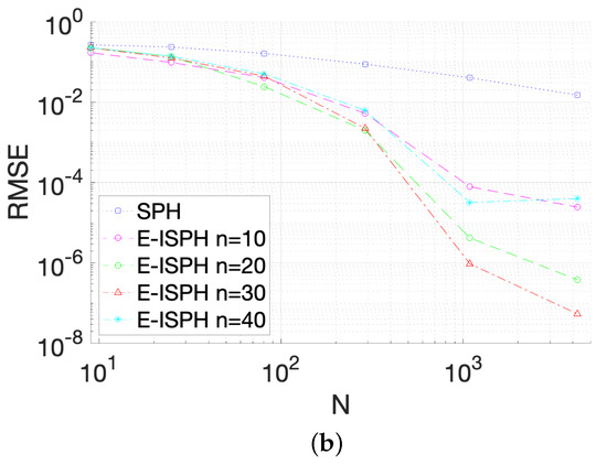 RMSEs versus number of data sites (). (a) Comparison between SPH and ISPH; (b) comparison between SPH and E-ISPH. All the computations are with starting normalized values and .