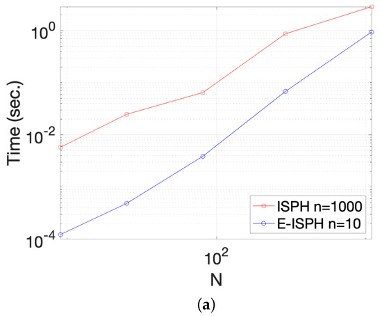 Some results on the accuracy and on the convergence are illustrated. The improvements in the linear approximation are evident in Table 1, where the RMSEs for the standard and the formulation with p = 1 are included, referring to the and data distributions. In Table 2 and Table 3, the error behavior adopting the iterative process ISPH, assuming with p = 1, is shown for and respectively. A significant reduction, for the two data sequences, can be appreciated by increasing N and the number of the iterations. In Table 4 and Table 5, the RMSEs refer to the enhanced iterative approach E-ISPH for and showing an accuracy comparable to ISPH requiring a reduced number of iterations. In Figure 2, Figure 3 and Figure 4 the RMSEs behavior is reported in a loglog plot comparing the SPH, ISPH and E-ISPH approaches. In Figure 5, the time (s), required by the ISPH and E-ISPH to reach a comparable accuracy in the approximation, is exhibited in a loglog plot too. All simulations have been executed with a processor 2.3 GHz Intel Core i9 8 core.