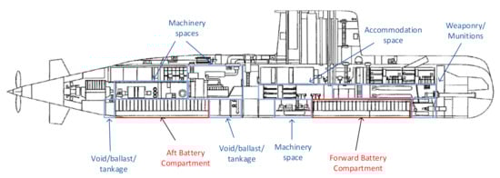 Due to the relatively high energy density of lithium-ion batteries, space, weight and power savings can be traded off for greater underwater endurance and range which can greatly increase submarine stealth [5]. Note the traditional diesel-electric submarine design in Figure 4 with two battery compartments, one each at the front and rear of the submarine. Surrounding compartments typically include void and tank spaces and unmanned machinery spaces. Manned machinery, accommodation and munition spaces are typically located on the deck above.