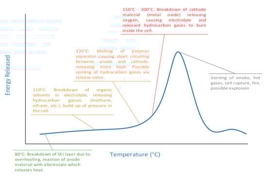 Most pertinent to fire risk is thermal runaway, a process where the uncontrolled temperature increase of a cell can lead to self-sustaining exothermic chemical reaction causing fire and potentially explosion [42].