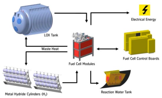The configuration shown in Figure 7 utilises metal hydride cylinders and a LOX tank. Waste heat from the fuel cell is used to release hydrogen gas from the storage cylinders and evaporate the LOX required to fuel the PEMFC. Water produced through the operation of the fuel cell is retained to maintain stability on the submarine as fuels are expended [55].