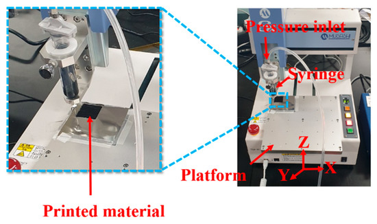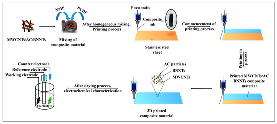 The materials used to fabricate the MWCNTs/AC/BNNTs composite electrode material were purchased and used directly to prepare the electrode material without any further treatment. The MWCNTs were purchased from Korea Co, AC was purchased from Korea Co. and the BNNTs were synthesized according to the following given procedure at the Plasma Center, Department of Physics, Jeonbuk National University, Republic of Korea. The BNNTs were synthesized using a 60 kW radio-frequency (RF) plasma torch system. The BNNT synthesis method using a plasma torch process was introduced by K. S. Kim [18]; it involves forming a high-temperature plasma of h-BN powder and then synthesizing BNNTs during the process of collecting in the collector. It is characteristic of this synthesis method that improved the BNNT manufacturing reaction by adding hydrogen during the synthesis process. However, while it is possible to synthesize BNNTs with very small diameters and excellent crystallization, this method inevitably produces h-BN residual powder and amorphous products during synthesis. The amorphous products are removed through a refining process. The printed MWCNTs/AC/BNNTs composite electrode material was synthesized according to the following listed steps. Initially, certain amounts of MWCNTs and AC (by equal weight ratio as 50 mg each) were taken to mix with certain selected different weight percentages of (BNNTs) (e.g., 0, 0.25, 0.50, 0.75 and 1 wt.%), i.e., 0, 0.25, 0.50, 0.75 and 1 mg. The ternary mixture of the MWCNTs/AC/BNNTs composite material was then mixed uniformly by grinding it for 1 h with a mortar and pestle. To prepare the ternary MWCNTs/AC/BNNTs composite electrode material, a mixture consisting of MWCNTs/AC/BNNTs, carbon black and poly(vinylidene fluoride) at a mass ratio of 8:1:1 (80, 10 and 10 mg) was well grounded for another 1 h with a mortar and pestle. Then the slurry of the latterly prepared mixture was prepared by adding N-methyl-2-pyrrolidinone into it. To make a uniform slurry of the MWCNTs/AC/BNNTs/N-methyl-2-pyrrolidinone solution, it was stirred for 120 min. As the uniform ink was prepared (as shown in the inset of Figure 1), the as-obtained MWCNTs/AC/BNNTs composite suspension was poured into a syringe framework and placed on a pneumatic dispensing system (Musashi Engineering Shot-Mini 200Sx, Japan) to apply a controlled pressure for the printing process. The syringe was mounted on a robotic head controlled by commercial software that enabled deposition of the ink composed of MWCNTs/AC/BNNTs through a movable stage. The film of the profile to be printed was transmitted to the robotic arm by the software as a series of coordinates. Air pressure of 72 KPa was applied from the dispenser, which forced the material (MWCNTs/AC/BNNTs) out of the syringe through the attached stainless-steel nozzle (model SNA-21G-B) of 21 Gauge, with a 0.52 mm internal diameter. The MWCNTs/AC/BNNTs composite solution was deposited layer-by-layer on a stainless-steel sheet skeleton. Finally, it was dried at 60 °C for 24 h before testing of its electrochemical properties.