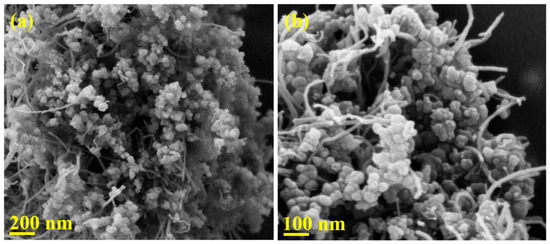 (a,b) FE-SEM images of the MWCNTs/AC/BNNTs ternary composite material at different magnifications.