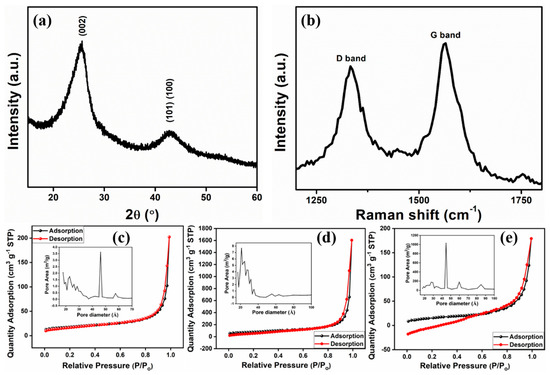 (a,b) The typical XRD and Raman analyses of the MWCNTs/AC/BNNTs ternary composite material, respectively. (c–e) N2 adsorption–desorption isotherms (inset show pore size distribution) of the MWCNTs, activated carbon and BNNTs, respectively.