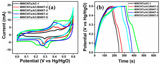 Electrochemical characterizations of printed the MWCNTs/AC/BNNTs ternary composite material with different contents of BNNT material: (a) cyclic-voltammetry (CV) response measured at a scan rate of 30 mV s−1; and (b) galvanostatic charging–discharging (GCD) curves measured at a current density of 1 A g−1.