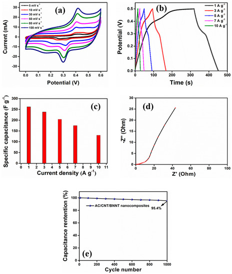 where, ΔV, I, m and ʃVdt represent the working potential window (V) of the MWCNTs/AC/BNNTs composite electrode material, electron flow of the charging-discharging cycle (A), mass of the deposited MWCNTs/AC/BNNTs composite material (g) and integral area under the discharge curve of the galvanostatic charge/discharge (GCD) cycle, respectively.
