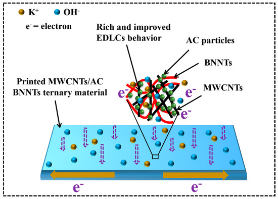 Schematic diagram showing the improved and rich electrical double layer capacitor (EDLC) behavior of the printed MWCNTs/AC/BNNTs ternary composite material.