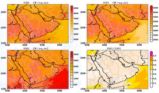 The importance of implementing large-scale photovoltaic (PV), concentrating solar power (CSP) and other solar energy applications and their economic benefits across several territories around the world has been analyzed in many previous studies [,,,,,,,,,]. The success of worldwide governments in developing solar energy technology primarily relies on the in-depth awareness of solar intensity levels and the distribution of global solar radiation, which is a challenging task due to the fact that, to date, the information on a global scale is limited. Singh et al. [] and Meltzer et al. [] mention that, based on the geographic location of the GCC region and the annual insolation (aggregated hours of sun, adjusted for solar intensity), the region is among those with the highest solar potential in the world due to the large annual availability of solar radiation. The annual average global solar radiation in the GCC region is estimated at 6 kWh/m2 per day, and the direct normal irradiance (DNI) is around 4.5 kW/m2 per day []. The abundance of solar energy resources depends on the sun’s irradiance parameters and spectral distribution. Prăvălie et al. [] mention that if the countries of the Arabian Peninsula collaborate strongly to this end, not only would Saudi Arabia be able to become a main solar energy hotspot in Asia, but the whole GCC region would be able to achieve this. Among the alternative renewable energy sources in the GCC region, solar energy stands out. Doukas et al. [] mention that the GCC countries have a remarkable opportunity for the use of alternative energy sources, in particular solar energy, and, therefore, should take a more proactive role in terms of investment in emerging technologies. According to Al-Badi et al. [] and Alnaser and Alnaser [], the highest annual solar radiation range, 2200 to 2500 kWh/m2, was recorded in Oman. In addition, the UAE has the second highest annual solar radiation of 2285 kWh/m2, which is supported by average sunshine of 10 h per day [,] due to its location. Saudi Arabia and Kuwait have relatively equal annual solar radiation of 2200 kWh/m2 [,,]. Kuwait is characterized by high average daily sunshine, around 12 h per day. A mean of nearly 2180 kWh/m2 for annual solar radiation was recorded in Bahrain []. Furthermore, the lowest value of annual average solar radiation was observed in Qatar at 2113 kWh/m2/year, with average daily sunshine of 9.5 h []. Nowadays, the GCC countries give special and increasing attention to the adoption of solar energy in order to reduce the energy cost of the growth demand. Dasari et al. [] stated that the total annual mean of global horizontal irradiance (GHI) over the Arabian Peninsula, including the GCC region, is between 6 and 8.5 kW/m2, and the DNI is between 3 and 6.5 kW/m2. The values of diffuse direct horizontal irradiance (DHI) are high among the majority locations of the region and curtailed along the Red Sea and surrounding coastal shorelines, at 1.2 and 4 kW/m2, respectively []. This study provided comprehensive evaluation of the solar energy resources with high-resolution spatial date over the GCC region on the basis of analysis of historical data spanning 37 years for the period 1980–2017, gathered from 46 in situ radiometer stations over the region and supported by assimilative weather research. Figure 2 summarizes the performance of GHI, DNI, and DHI in W/m2, including the diffuse fraction (DHI/GHI) of the GCC region. The diffuse fraction (DHI to GHI ratio) indicates enhanced cloud cover and/or a higher aerosol load over the average duration [] and is high over the northern locations and low over the southern parts of the central GCC region during the winter, while it is high across the southern and central regions, and low over the north during the summer []. The main elements that drive DHI variability are the clouds over the northern part of the GCC region in the winter and the loading of aerosols over the southern and central portions of the GCC during the summer due to desert dust. According to Dasari et al. [], the evaluations of different parameters of solar radiation and aerosol characteristics suggest that there are considerable solar energy potential resources in the region, with the southeast and northwest identified as the most appropriate locations for exploiting solar energy and as the areas with minimal cloud coverage across the GCC countries.