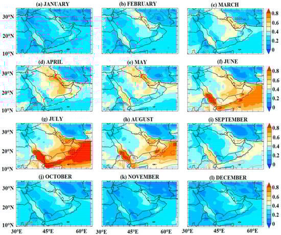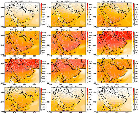 There are considerable alterations in the values of DNI and GHI between the winter and summer that indicate a high seasonal variance in the solar energy potential across the GCC region due to the sensitivity of the regional climate. Figure 3 and Figure 4 provide more details on the monthly behavior of DNI and GHI. Moreover, the monthly values of DNI, GHI, and DHI exhibited gradual development from January to April, with higher values occurring from May to September []. Between February and November, the position of the highest mean values of DHI shifted to the south, while from January to September, the position of maximum mean values of GHI and DNI migrated from the south to the north. The high values of DHI from April to September are due to the effect of dust across the southern and central regions during the summer and the winter’s cloud impacts on the northern region. The transition seasons, spring and fall, show intermediate DNI and GHI values from winter to summer; however, their distributions present considerable similarity with the winter. GHI and DNI have higher percentage values of the variations’ coefficient over the north of the region during winter and can reach around 17% south of 15° N during the summer due to the monsoon-related clouds and the distribution of dust. The northwestern and southeastern parts of the region are more desirable for harvesting solar energy despite the presence of some dust. The evaluation of various solar irradiance parameters gives an overview of the solar energy resource potential across the GCC region, thereby promoting significant sustainable opportunities to develop solar energy applications in the GCC region. Nonetheless, insufficient awareness, a paucity of experience, and technological deficiencies have hampered the comprehensive evaluation of solar energy characterization across the region. The analysis of long-term solar energy resource conditions over the GCC region can develop viable renewable energy projects’ capabilities and fill the territorial gaps of solar resources. Furthermore, the Arab Peninsula, in particular the GCC countries with their 2030 future plans, are among the fastest-growing solar energy markets. This research indicates significant details for policy makers and researchers to establish effective strategies for the harvesting of renewable energy.