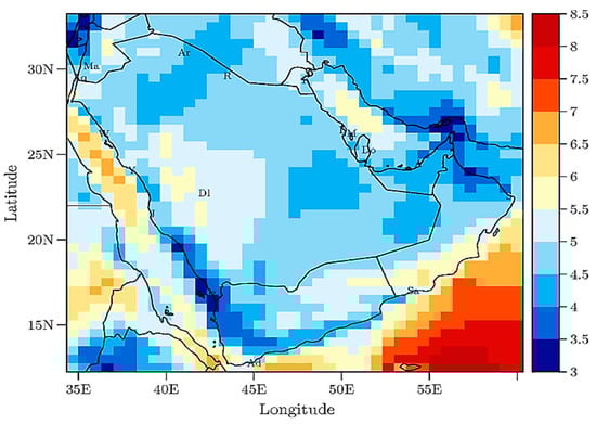 Average monthly wind speed (m s⁻1) over the Red Sea in the GCC region at a height of 50–120 m, based on historical data spanning 18 years. Copyright © 2021 Elsevier [].