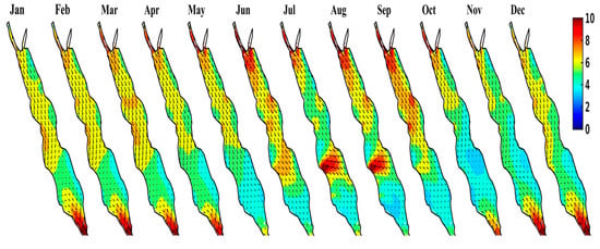 Furthermore, there are distinctive diurnal wind energy variations in each part of the region, and diurnal pattern variations with the seasons. Figure 8 presents the average monthly wind speed over the Red Sea in the GCC region at a height of 50–120 m based on an analysis of historical data spanning 18 years. An assessment of the spatial distribution of wind energy in the Red Sea shows that related energy concentrations usually occur in three main locations during the 18 years of observations, where the density of wind energy is stronger compared to other locations of the Red Sea, as shown in Figure 8. Moreover, it was observed that there is a stronger southeast wind over the southern Red Sea and weaker northwest wind along the northern Red Sea throughout El Niño periods and a weaker southeast wind along the southern Red Sea with stronger northwest wind speed along the northern Red Sea throughout La Niña periods. The mountain chains overlooking the Red Sea affect the prevailing local wind speed patterns and reconstruct the Red Sea into a practical and realistic wind channel, where the prevailing wind speeds are on the main axis. However, the monthly wind speed performance over the Red Sea shows a great opportunity for the harvesting of wind energy from the Red Sea due to more significant potential wind speed locations. The most suitable sites for wind energy applications are in Saudi Arabia, the only GCC country located on the Red Sea.